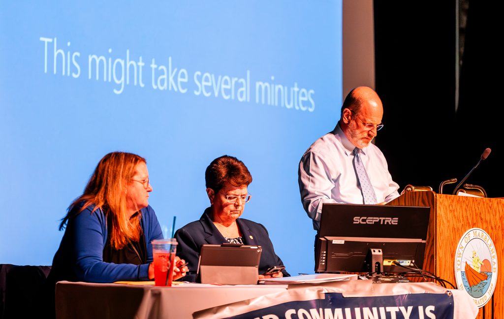 The computer connected to the large display screen behind, from left, Town Clerk Robin Michaud, Town Counsel Lisa Mead, and Town Moderator Jack Attridge, shows an ironic message as the start of Town Meeting was delayed, and eventually postponed, due to the middle school not being able to fit the more than 2,000 people attending the meeting Monday night.
