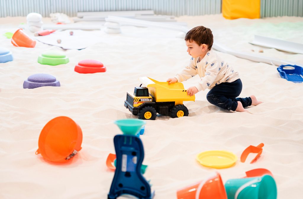 AJ Patrick, of Salem, pushed a Tonka truck through the sand at Sandmagination in the Northshore Mall.