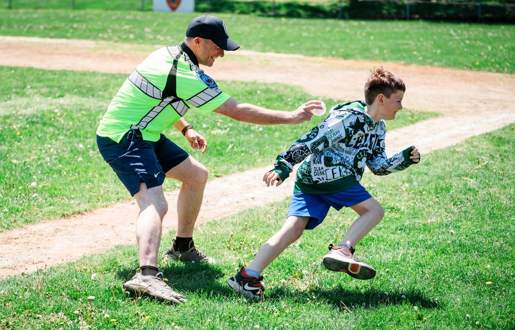 Johnson School Resource Officer Jason Hoffman makes the tag on fourth-grader Jax Tria during the wiffle ball game between the fourth grade and the Police Department on Monday.