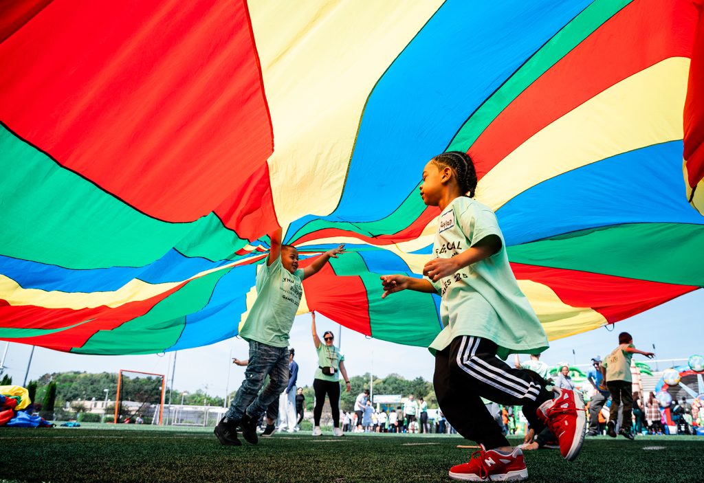 Hood Elementary School students race around underneath a rainbow parachute as they enjoy the 55th Lynn Special Games.