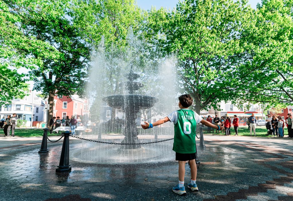 Macio Paula, of Lynn, stands with his arms outstretched to catch the spray coming off of the fountain in Lynn Common during the city's 175th birthday celebration on Wednesday.