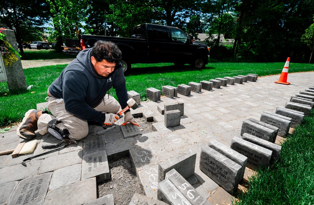 Julio Escobar, of Stone and Garden Solutions, lays down the inscribed pavers of those who donated to the War Memorial in Lynnfield on the path leading up to the memorial.
