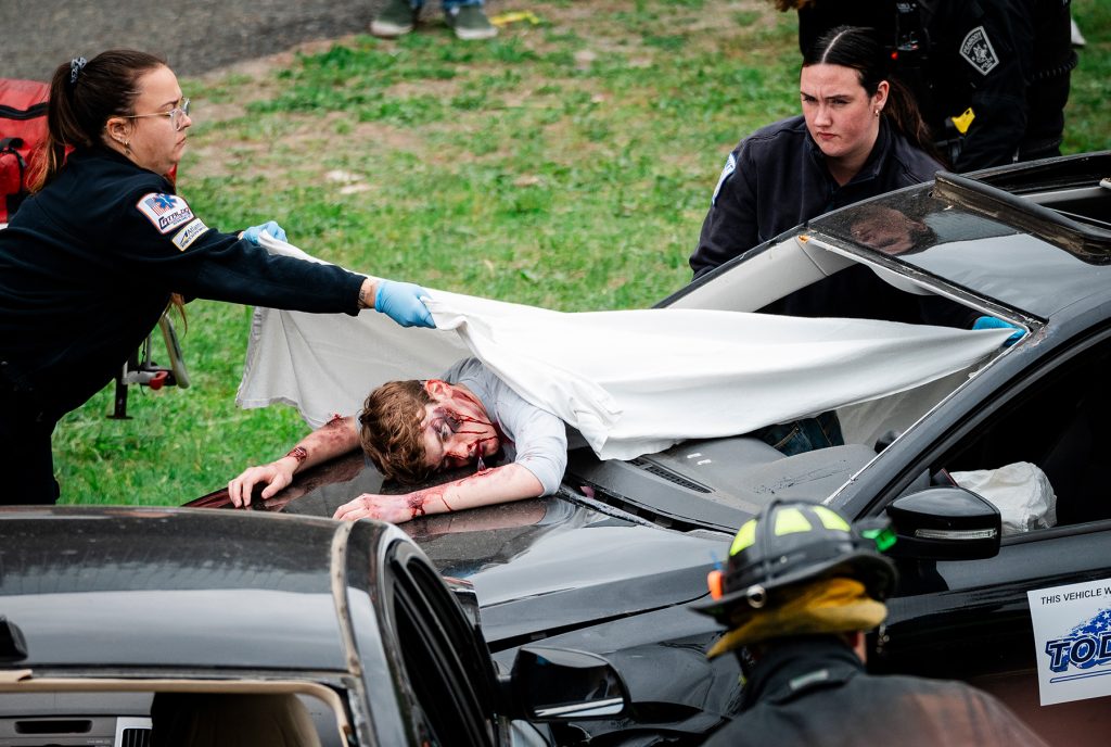 EMTs put a sheet over Peabody High student Myles Fitzgerald after he was pronounced dead during the mock car crash scenario at the school on Wednesday, meant to demonstrate the consequences of driving under the influence.