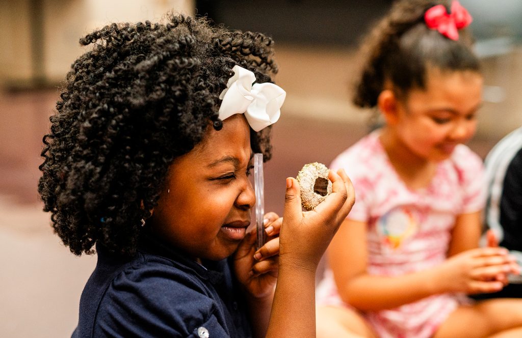 Brickett Elementary School kidergartener Wisshama Joseph Antiochus uses a magnifying glass to study a sea urchin during the Northeastern University Marine Center visit to the school sponsored by the Friends of Lynn and Nahant Beach.