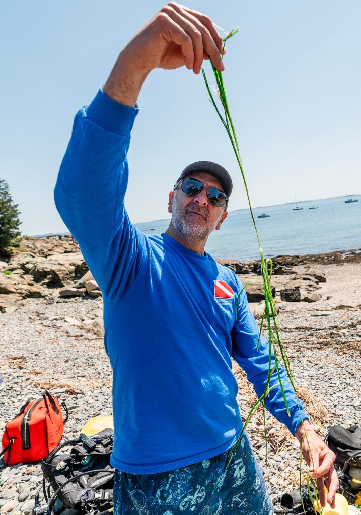 Phil Colarusso, a marine biologist with the EPA, shows off a sample of eelgrass that he and his team are studying off the coast of Nahant.