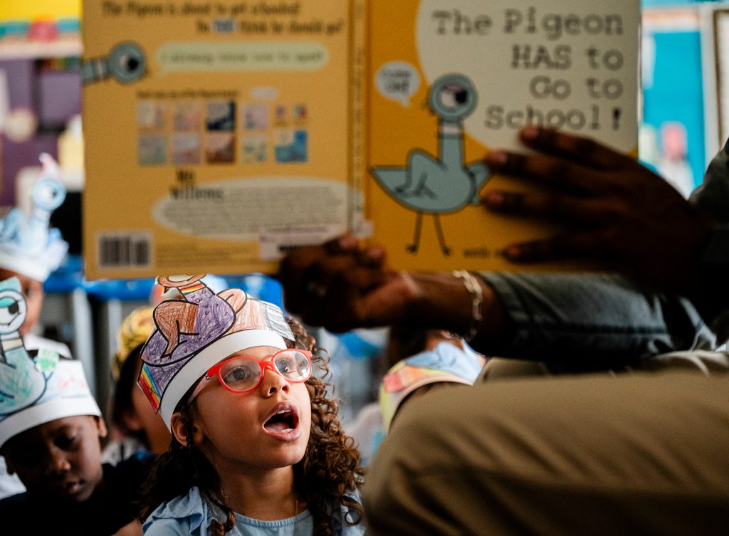 Harrington Elementary School first-grader Angelique Rosado listens closely as Stephen Basden, who works with the Special Olympics and is an LPS alumni, reads "The Pigeon HAS to Go to School!"to her class during Harrington Elementary School Reads Day on Wednesday.