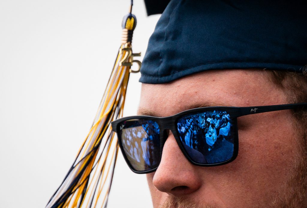 Fellow graduates are reflected in the sunglasses of Andrew Orlofski during Lynnfield's graduation ceremony.