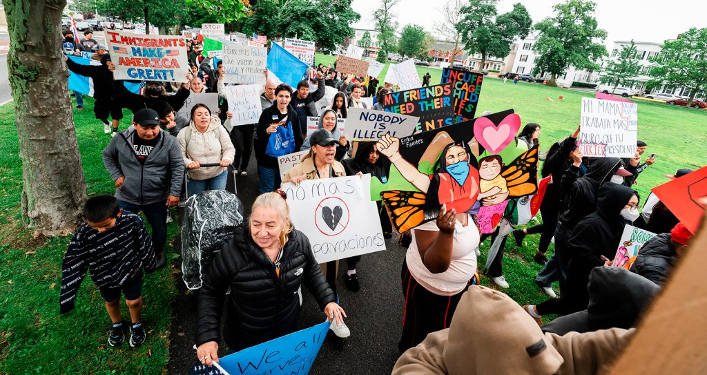 Hundreds march around Lynn Common as they protest against ICE arresting and deporting immigrants during a demonstration on Tuesday.