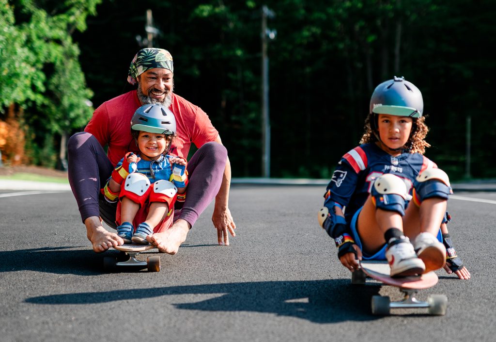 Nate Fontes-Fried, of Swampscott, skateboards with his sons Lucas, left, and Ethan.