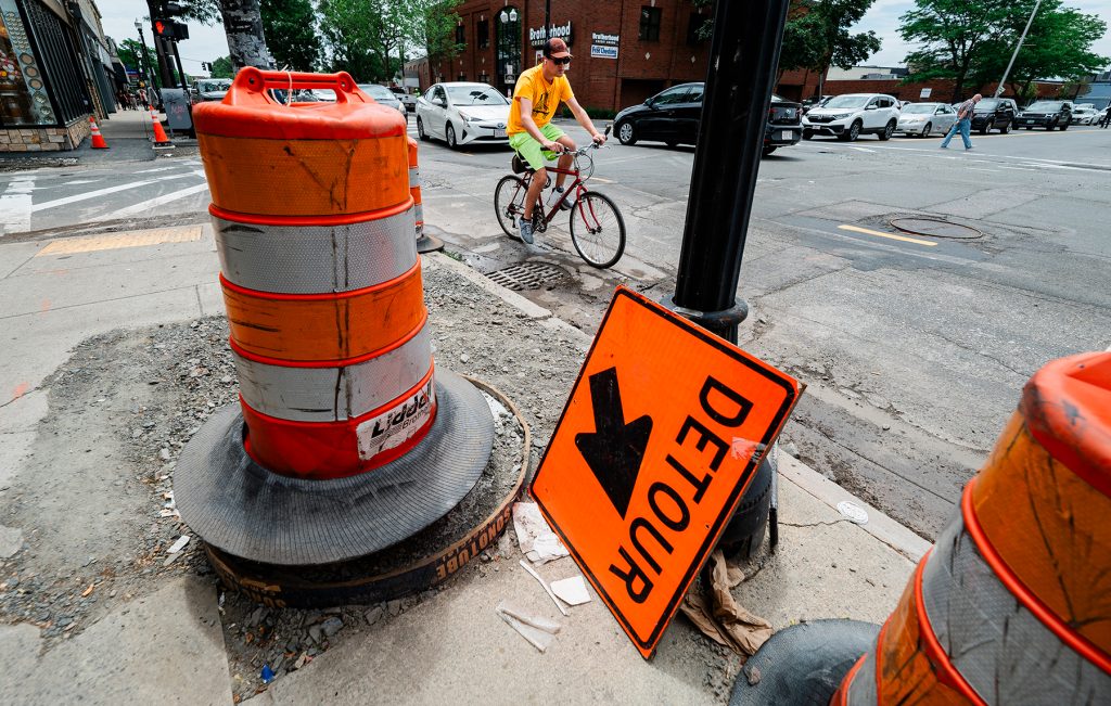 A cyclist is framed by orange cones and a detour sign as he rides down Market Street in Lynn Tuesday morning amid the construction of the Northern Strand Expansion.