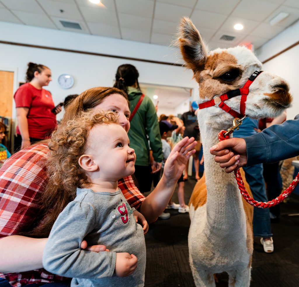 The face of Saugus' Lorelai Melanson lights up as she meets 17-year-old alpaca, Sir Erik, during his visit to Saugus Public Library on Wednesday.