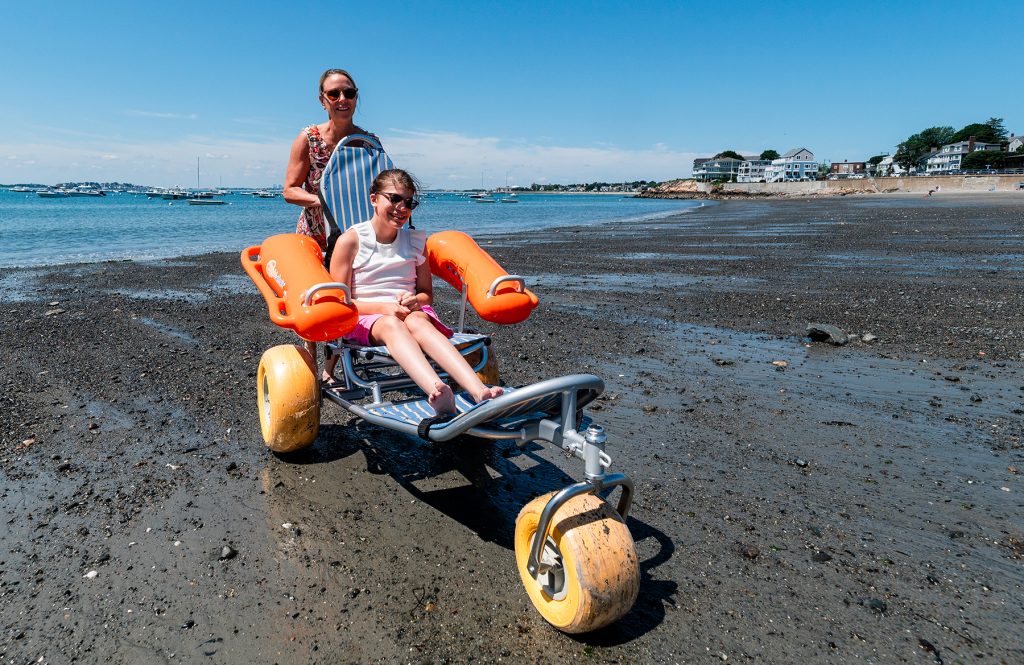 Nicole Puzzo pushes her daughter, Stella, around Fisherman's Becah in a Mobi-chair that was donated to Swampscott by Bernard, Jessica, Deb, and David Newman.