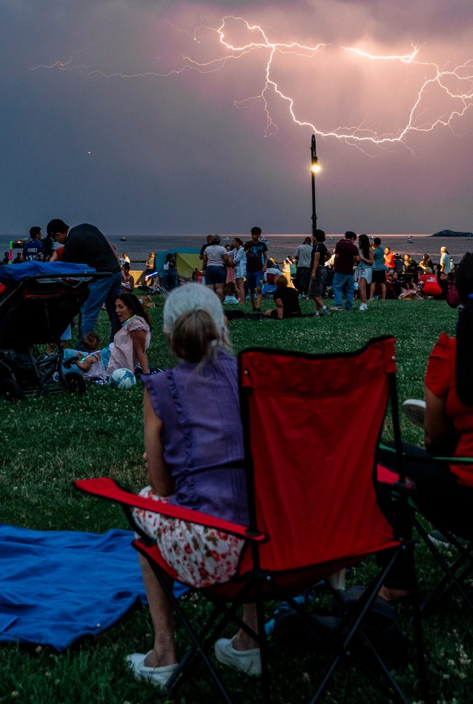 Mother Nature put on a display of her own as a crowd gathers in Red Rock Park for the Lynn/Swampscott Fourth of July celebration Thursday night.