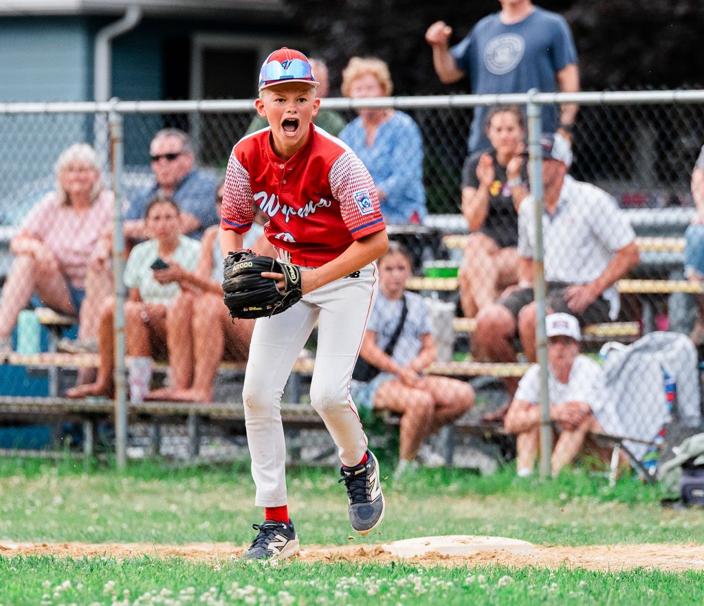 Wyoma's Ben Zukowski hypes the team up after turning a double play against Swampscott.
