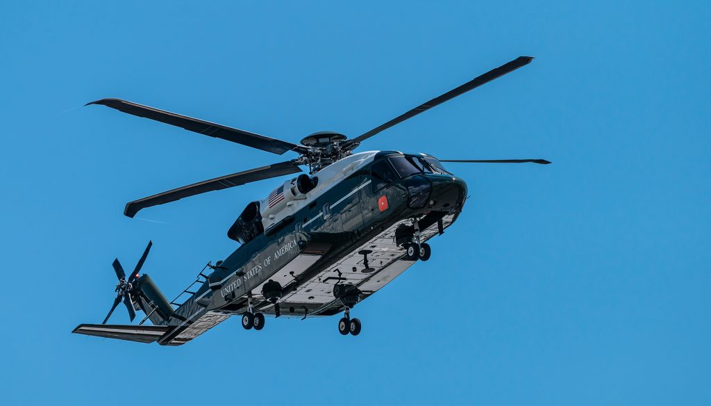 A Marine One Sikorsky VH-92A helicopter, which is powered by two General Electric CT7-8A6 engines made in Lynn, circles over GE Aerospace in Lynn before landing Tuesday afternoon.