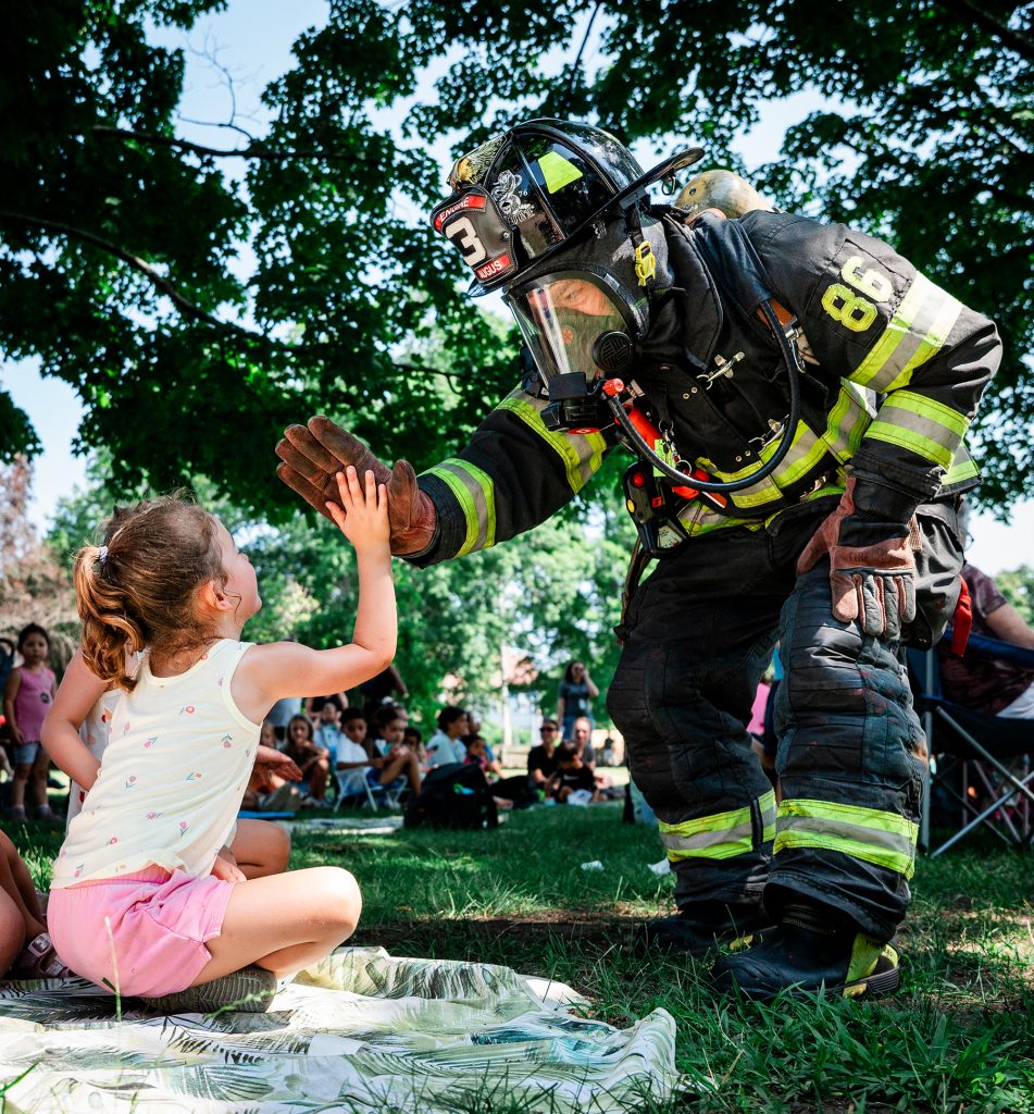 Saugus firefighter Derek Lanzillo high-fives Thea Curtis, of Saugus, during the fire safety demonstration at Saugus Iron Works on Wednesday.