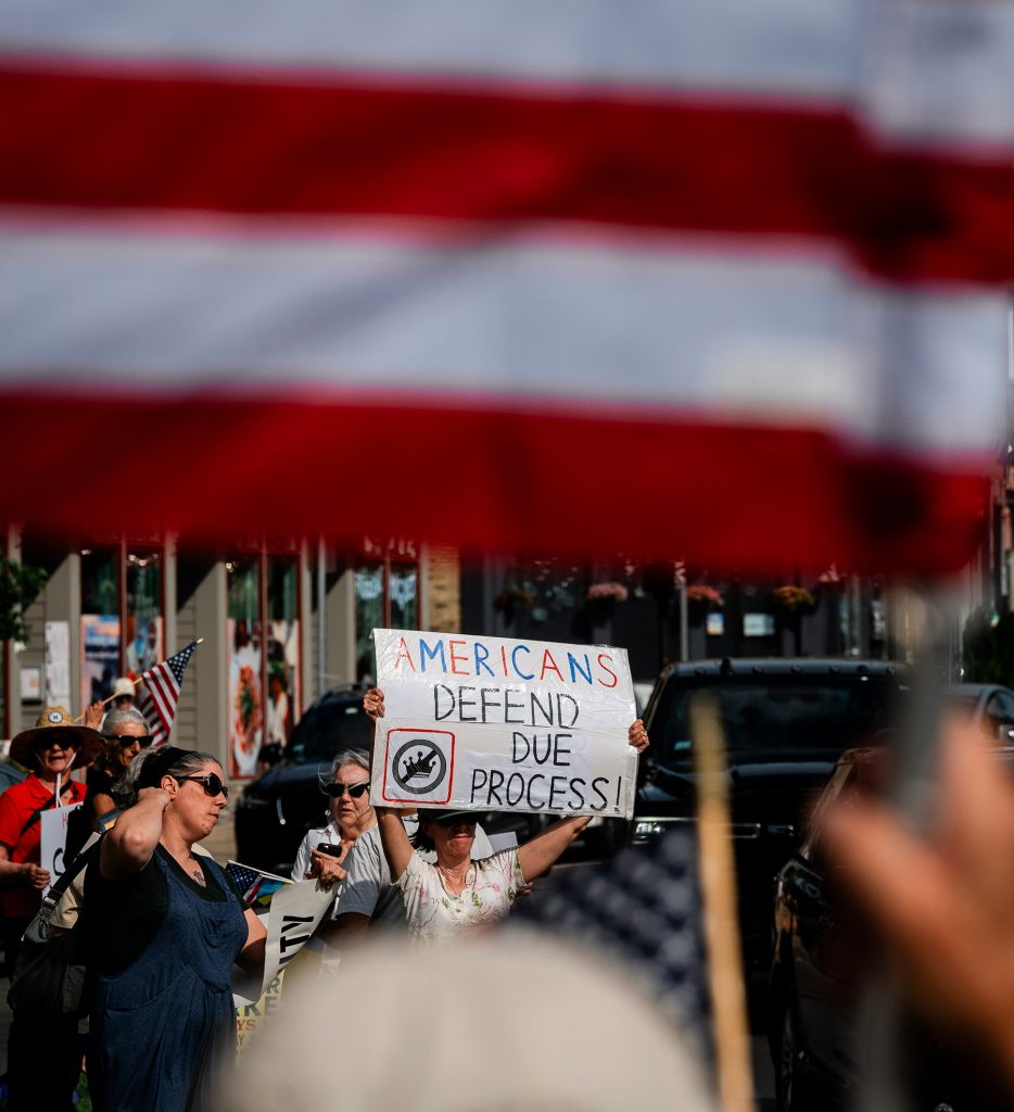 Kate Borten, of Marblehead mourns the "death" of USAID under the Trump administration during the "Funeral for Democracy" demonstration in Marblehead on Thursday.