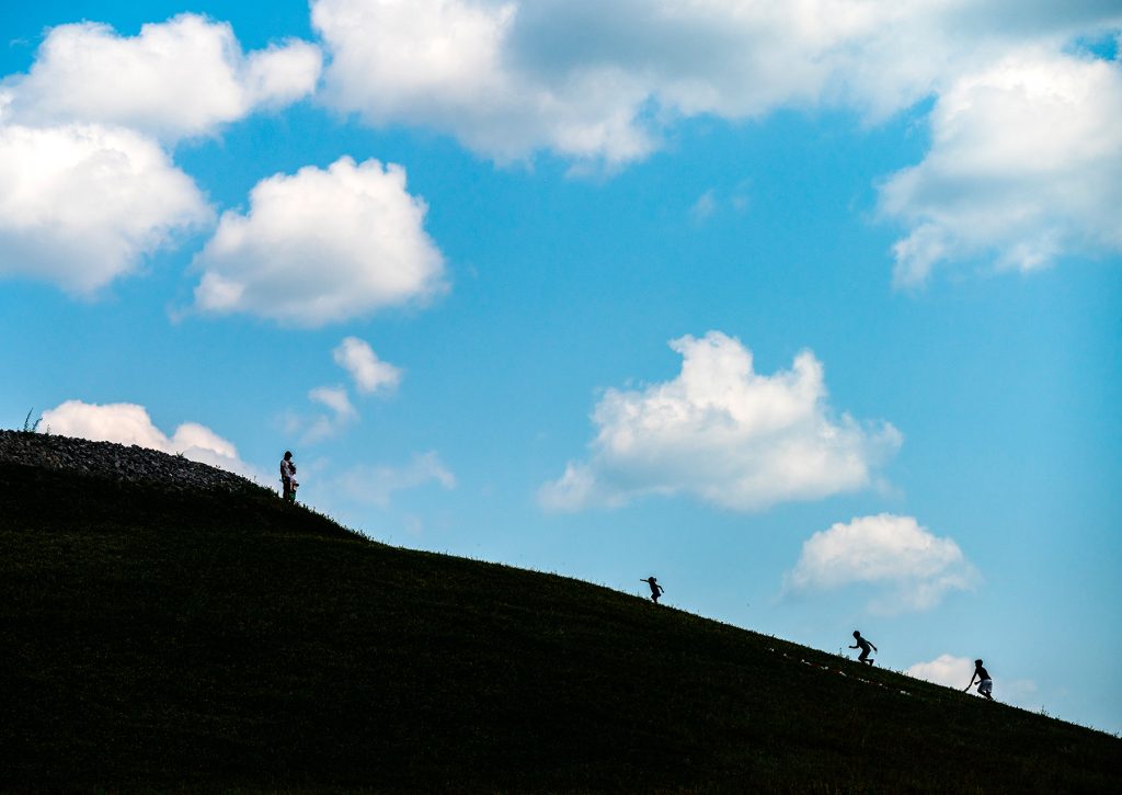 A family is silhouetted as the run up the side of a hill at the newly opened Lynn Harbor Park.