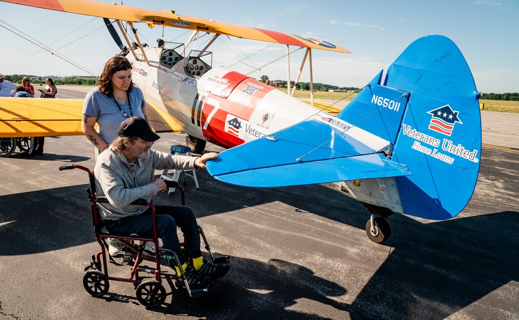 U.S. Navy veteran Fred Allen, who lives at Alliance Health at Rosewood in Peabody, takes in the beauty of the Stearman biplane that he will soon take flight in, thanks to Dream Flights, as he's wheeled around the plane by Alliance Health at Rosewood Activities Director Sofia Rodriguez.