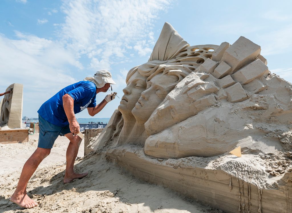 Slavian Borecki, of Poland, uses a straw to clear away sand debris as he works on his sculpture during the Revere Beach International Sand Sculpting Festival on Friday.