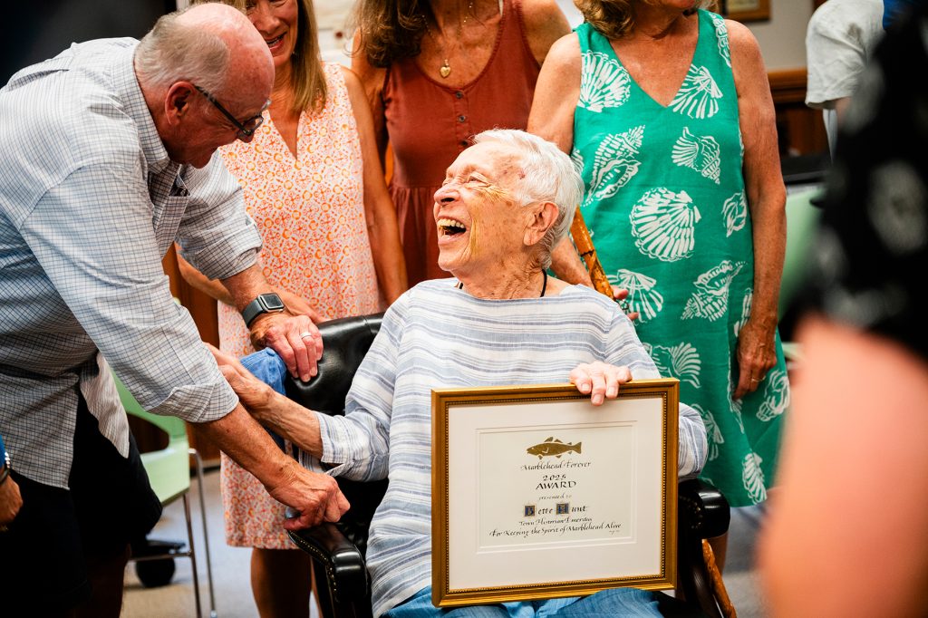 Bette Hunt is congratulated after winning the Marblehead Forever Award on Tuesday.