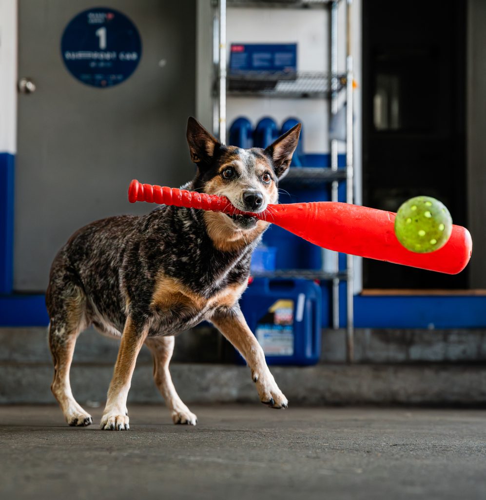 Pepper keeps her eyes locked on the wiffle ball as she gets ready to hit it with a bat.