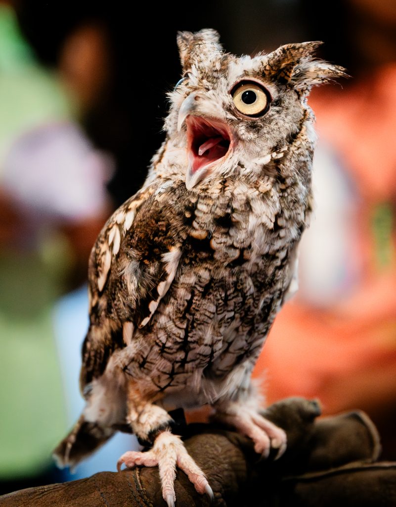 A gray eastern screech owl calls out as she visits Saugus Public Library on Thursday.