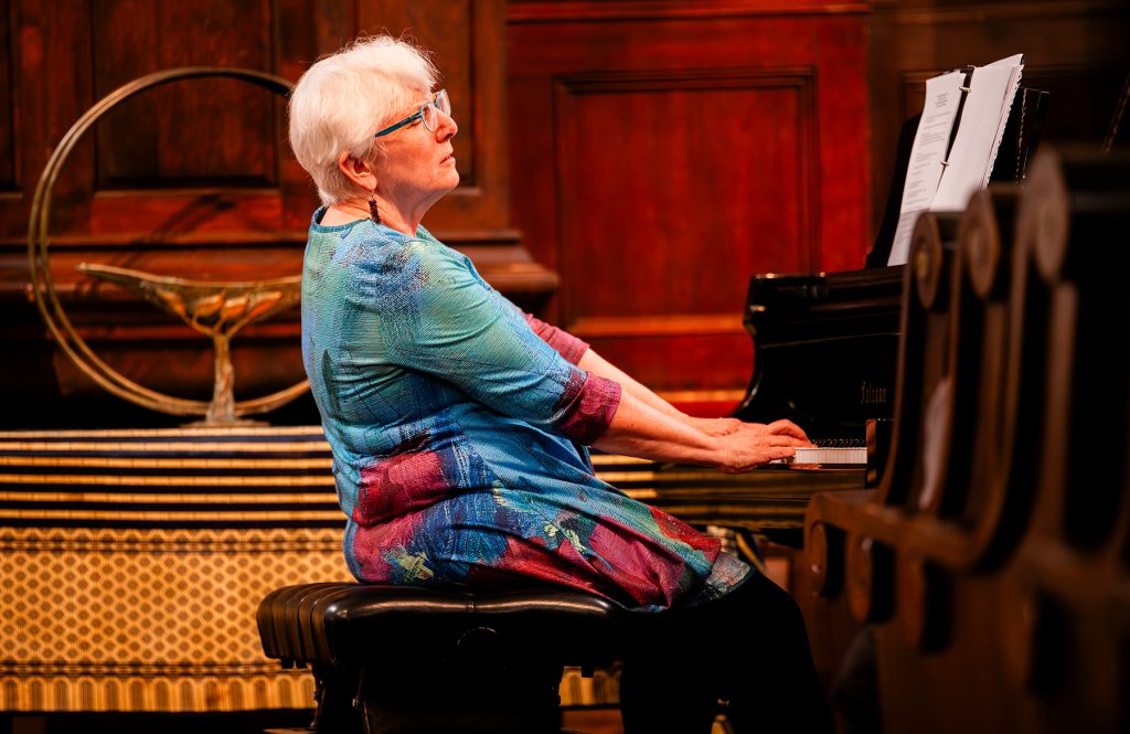 Noted pianist Jacqueline Schwab enterains the crowd gathered at the Unitarian Universalist Church during a concert to benefit Ukrainian cultural workers and other Ukrainians in need as the war with Russia continues.