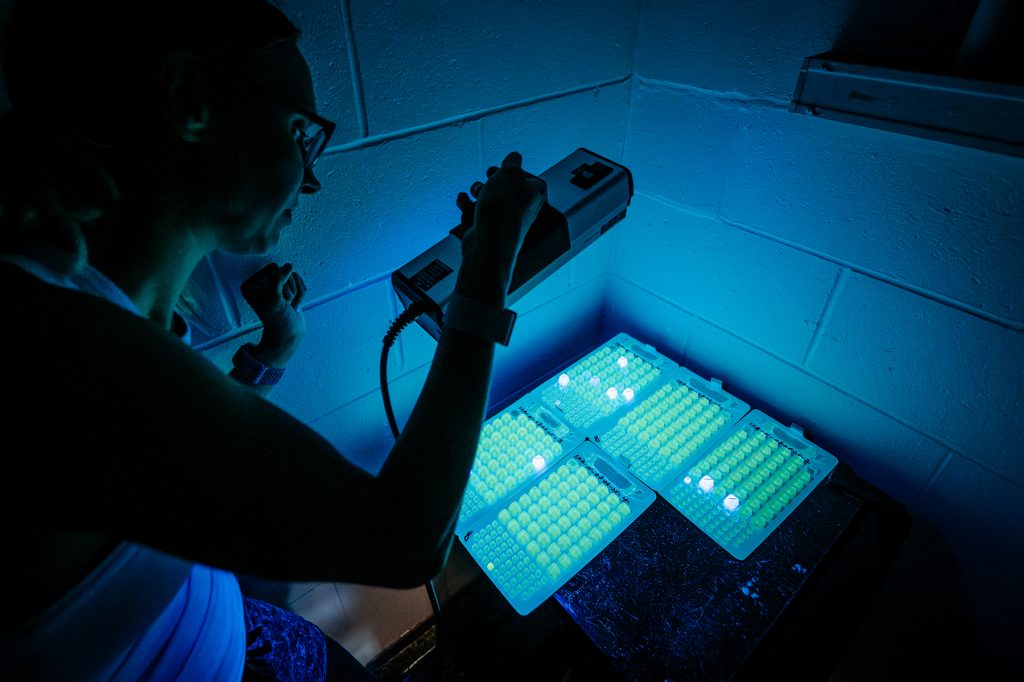 Save King's Beach founder Andrea Amour holds a UV light over water samples taken from along Nahant Beach. The brightly glowing samples indicate the presence of bacteria.