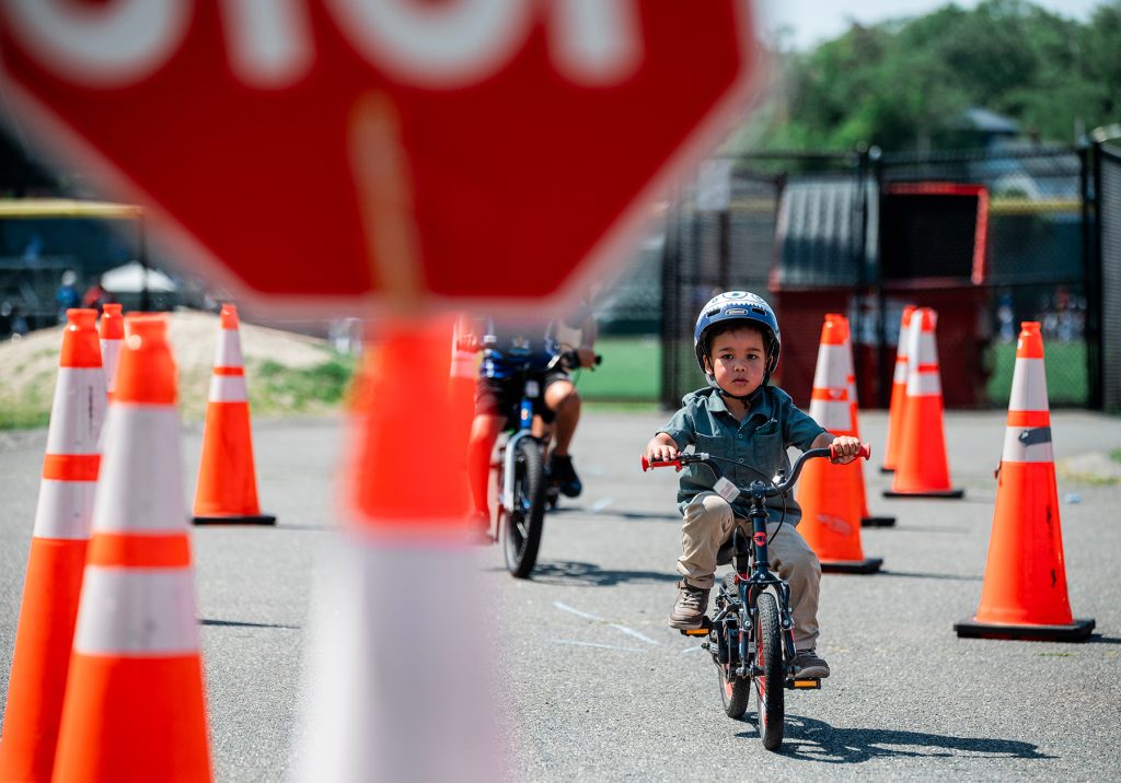 Francis Medrano, of Lynn, makes note of the stop sign as he pedals through the obstacle course set up by Lynn Police for Bicycle Safety Day on Tuesday.
