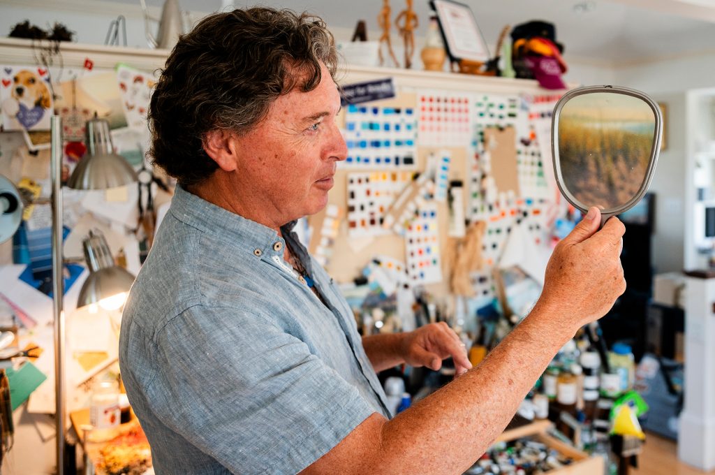 Swampscott painter Mark Shasha will often use a mirror to examine his paintings. Altering his perspective allows Shasha to see what parts of the painting are working, and which ones aren't.