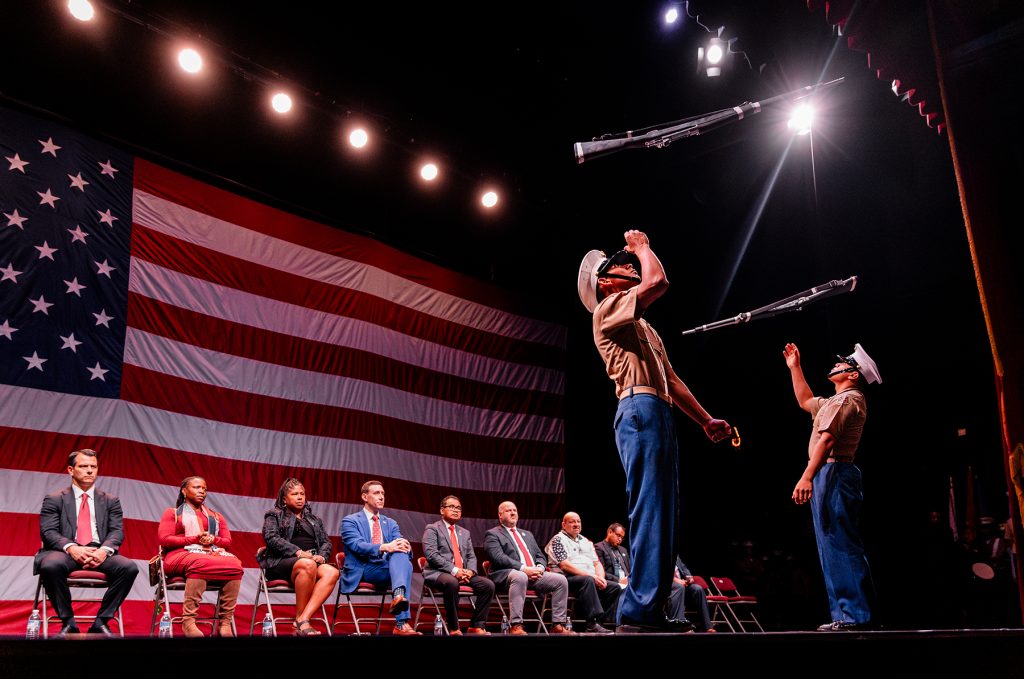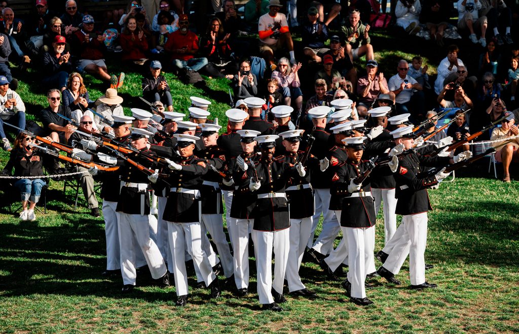 The U.S. Marine Corps Silent Drill Platoon performs at Fort Sewall in Marblehead during the Marine Week opening ceremony in honor of the 250th birthday of the Marines.