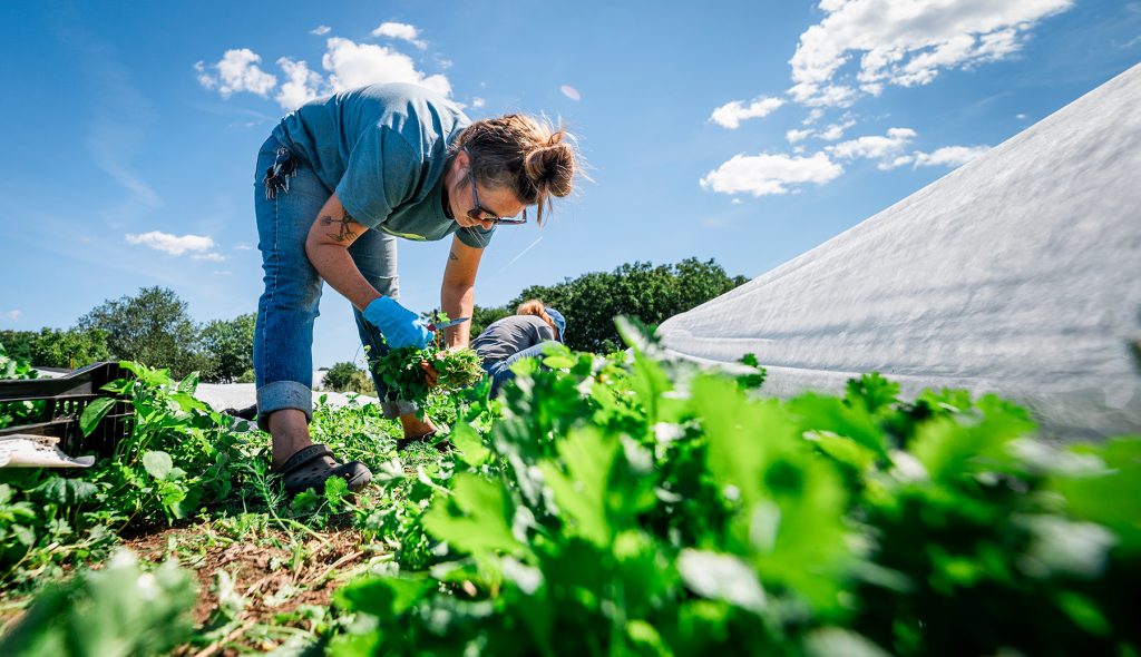 Newhall Fields Community Farm Manager CJ Hughes picks cilantro at the farm on Thursday.