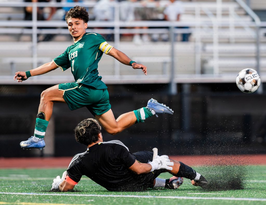 Lynn English keeper Kevin Rojas blocks a shot by Lynn Classical's Edison Chacon.