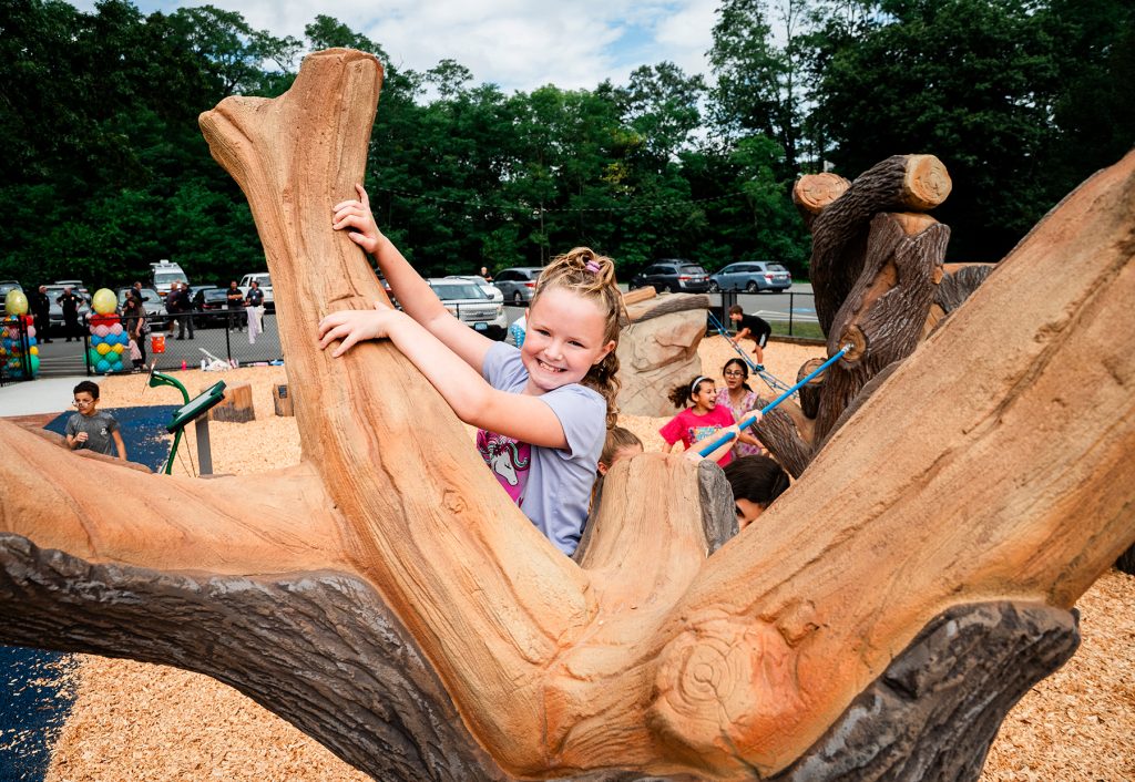 McCarthy Elementary School student Hazel Wills climbs to the top of a new play structure at Lt. Ross Park/CyTenny Playground in Peabody.