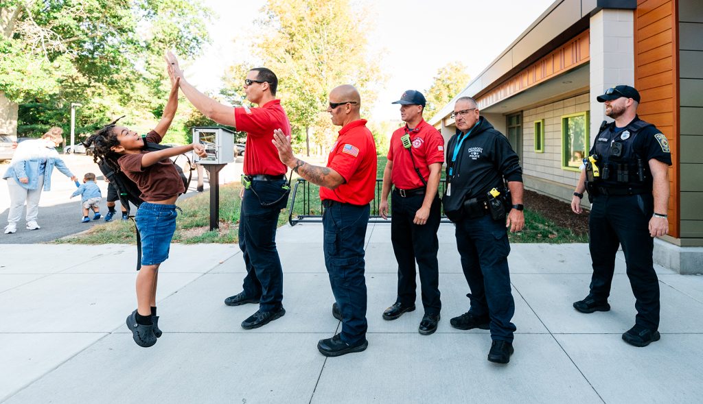 A Welch Elementary School student leaps up to high-five Peabody Firefighter Anthony Robinson as, from left, firefighters Jon Padios and Ryan Gill, School Resource Officer Eric Ricci, and Officer Thomas Southern wait their turn during High Fives for Henry on Friday.