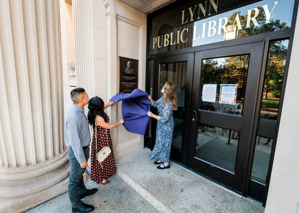 The family of Patrick J. McManus, from left, John McManus, Laura Christensen, and Debbie McManus, unveil his plaque during the dedication of the Lynn Public Library Patrick J. McManus Building Thursday evening.