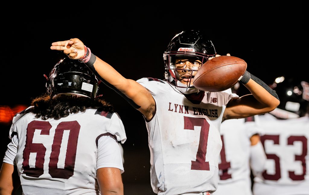 Lynn English quarterback Shane Knowlton Simard celebrates a first down after a QB-keeper.