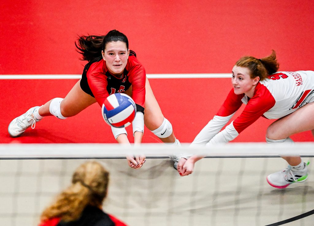 Marblehead's Lila Moniz, left, and Sydney Faris each dive for the ball and keep it in play.