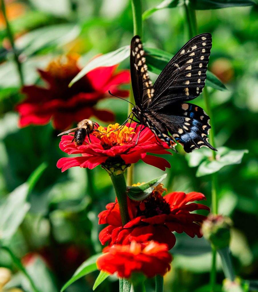 A black swallowtail butterfly shares a zinnia flower with a bee at Newhall Fields Community Farm in Peabody.