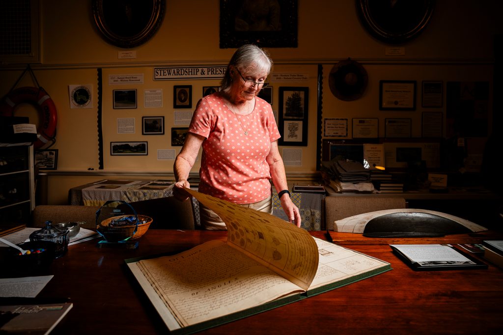 Nahant Historical Society Executive Director Julie Tarmy looks through a book of illustrations created by Lydia Bishop which is housed in the society's private collection.