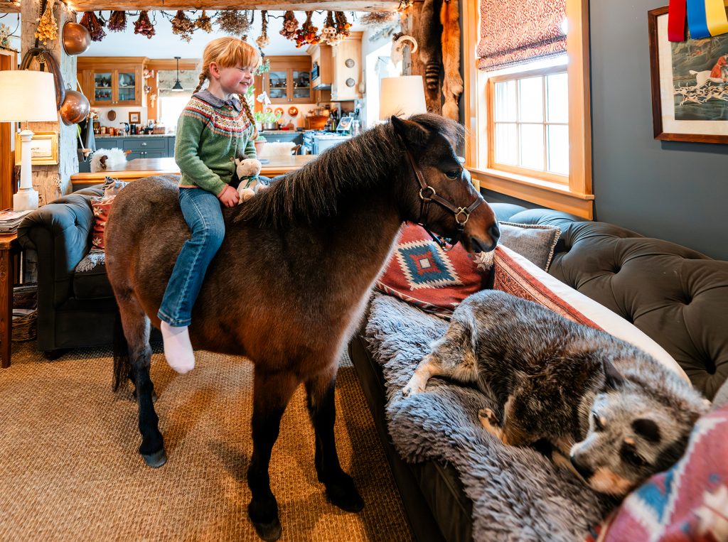 Flora Peach rides Pippin the pony around her family's Marblehead home as her dog, Rosie, looks on from the couch.