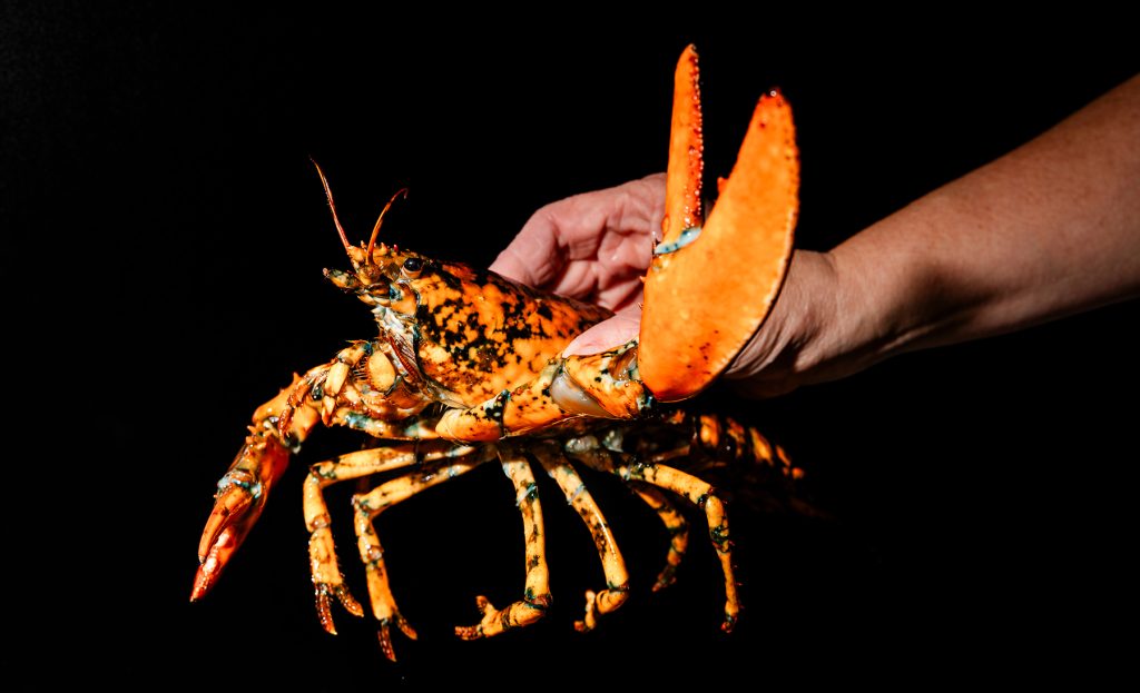 The mottled black and orange coloring on calico lobster Jackie is caused by genetic variation, which causes her cells to produce different pigments.