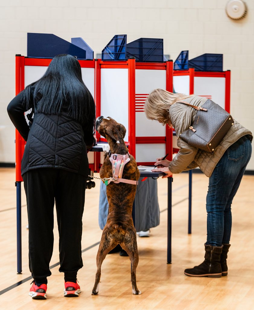 A dog checks to see how its human voted in the Ward 7 city council race during Tuesday's election in Lynn.