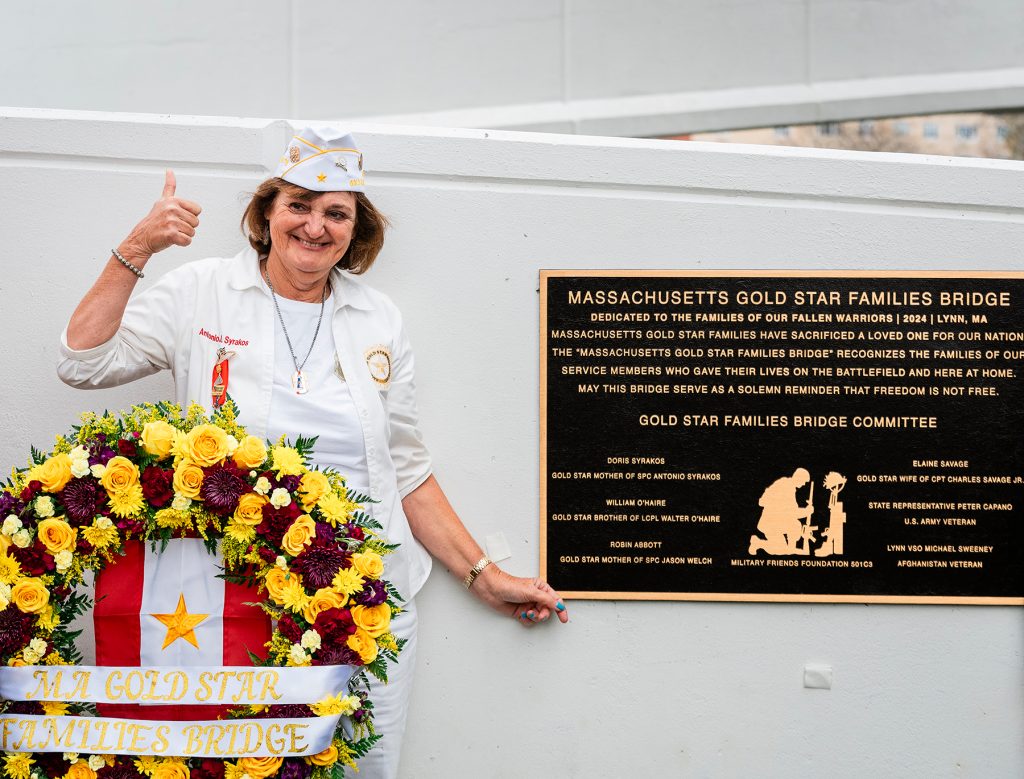 Gold Star Mother Doris Syrakos, of Lynn, who was instrumental in the dedication of the Massachusetts Gold Star Families Memorial Bridge, gives a thumbs up as she stands next to the plaque on the bridge that spans the Lynnway.