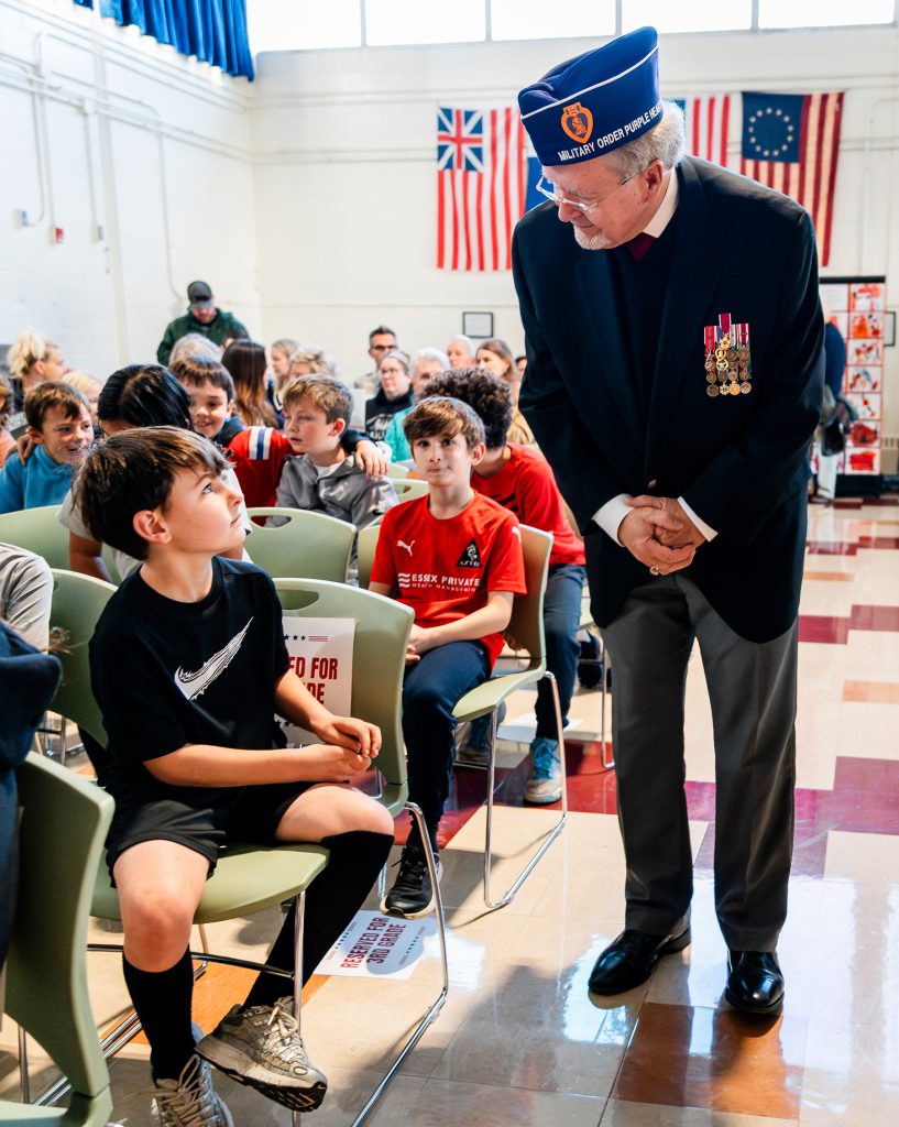 Army Col. Dennis Treece, of Lynn, chats with Johnson School third-grader Frederick John Blair before the start of the Veterans Day ceremony in Nahant on Friday.