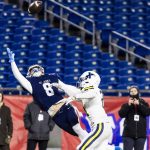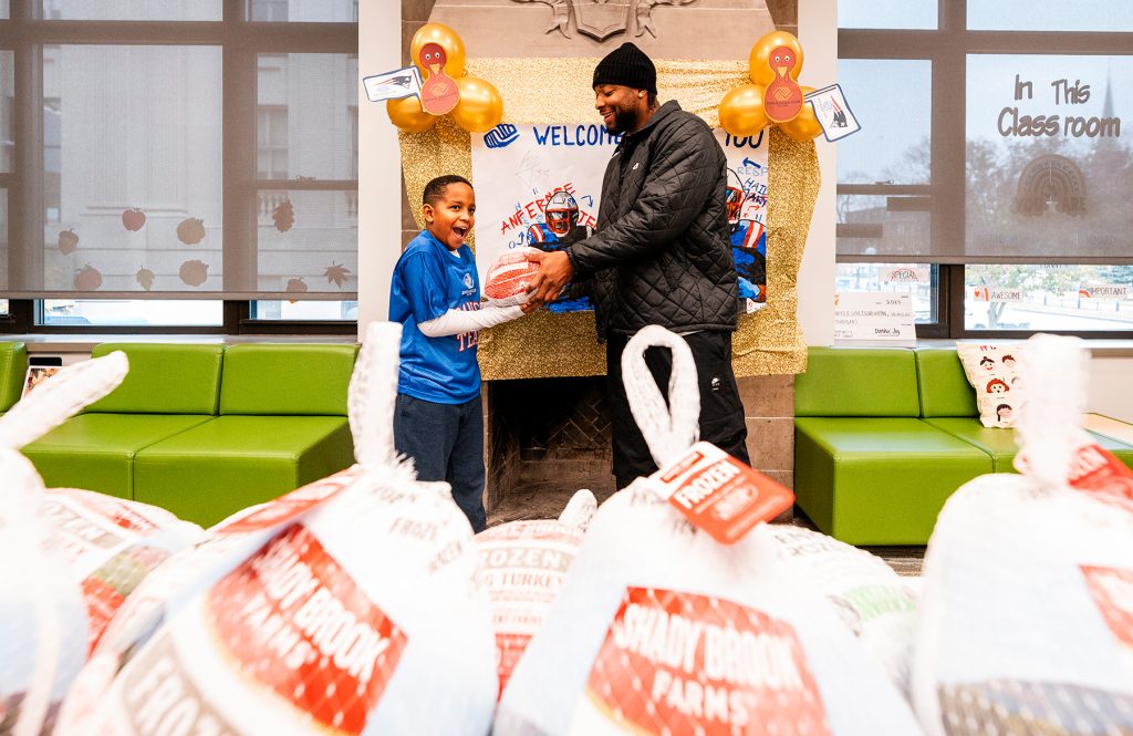 Patriots linebacker Anfernee Jennings gives a Thanksgiving turkey to Boys & Girls Club of Lynn member Daniel Nivar as he visits the club on Tuesday.