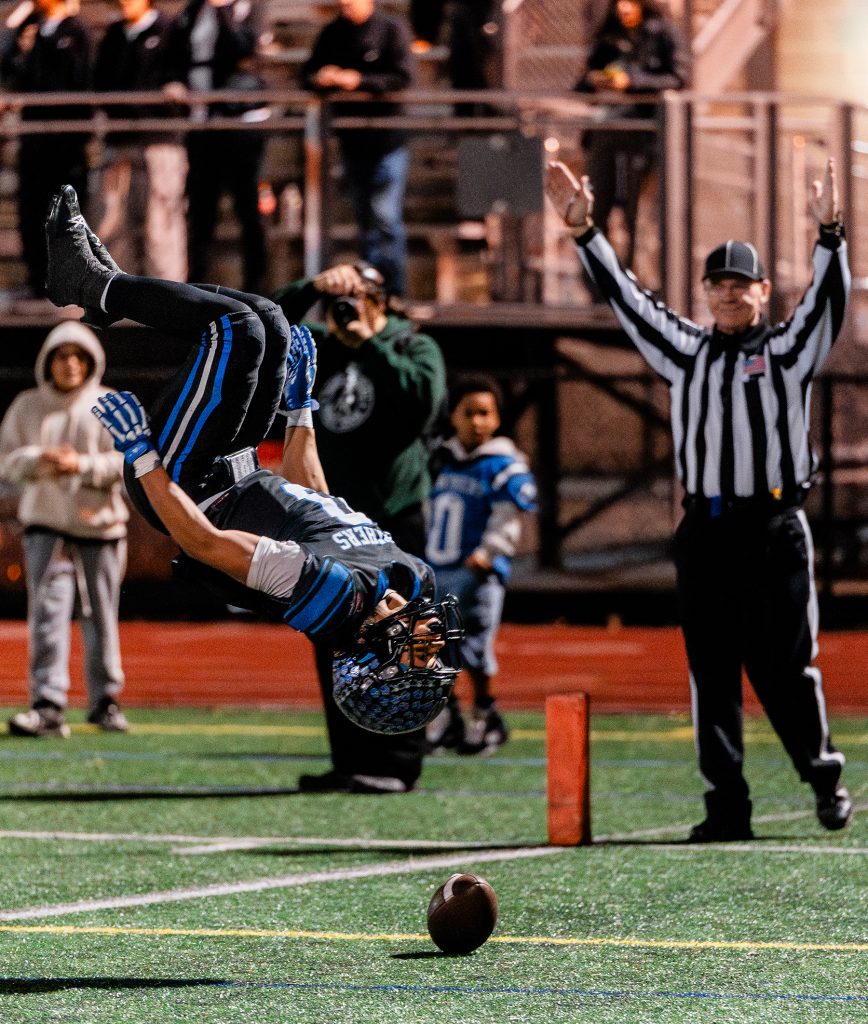 KIPP's Aavian Pena does a backflip after scoring a touchdown against Lynn Tech.