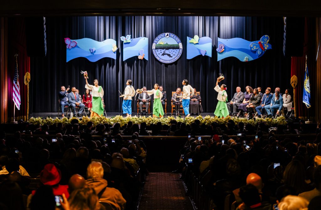 Iskwelahang Pilipino of Boston performs a traditional Filipino dance during Lynn's inauguration ceremony Monday night.