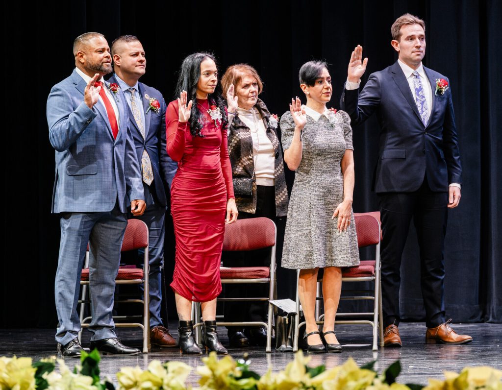During the ceremony, Brian K. Castellanos, Lorraine M. Gately, Brenda Ortiz McGrath, Lennin “Lenny” Peña, Andrea L. Satterwhite, and Tristan J. Smith were sworn in as members of the School Committee.